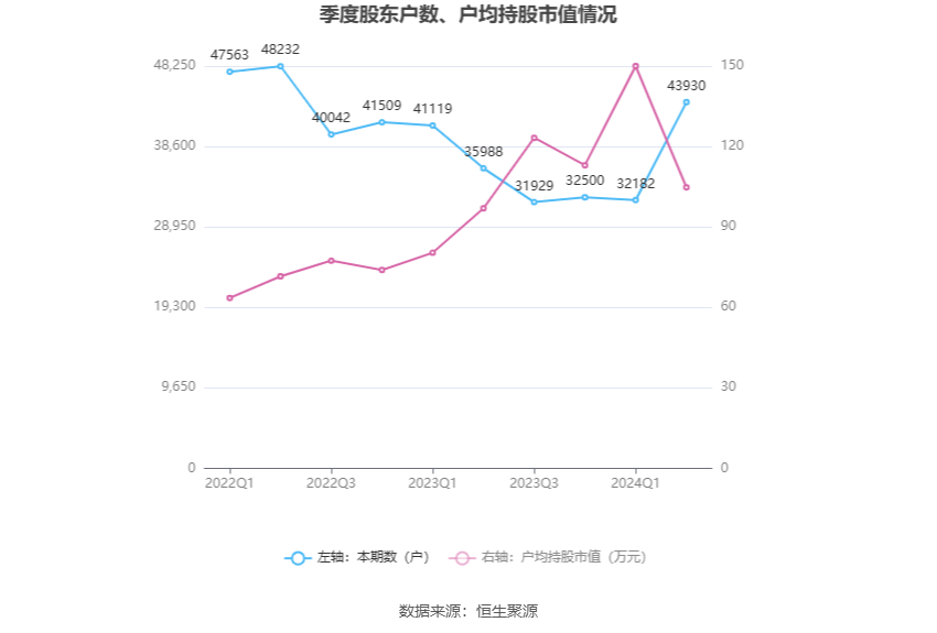筹码集中度方面,截至2024年上半年末,公司股东总户数为4.39万户,较一季度末增长了1.17万户,增幅36.50%;户均持股市值由一季度末的149.99万元下降至104.79万元,降幅为30.14%。