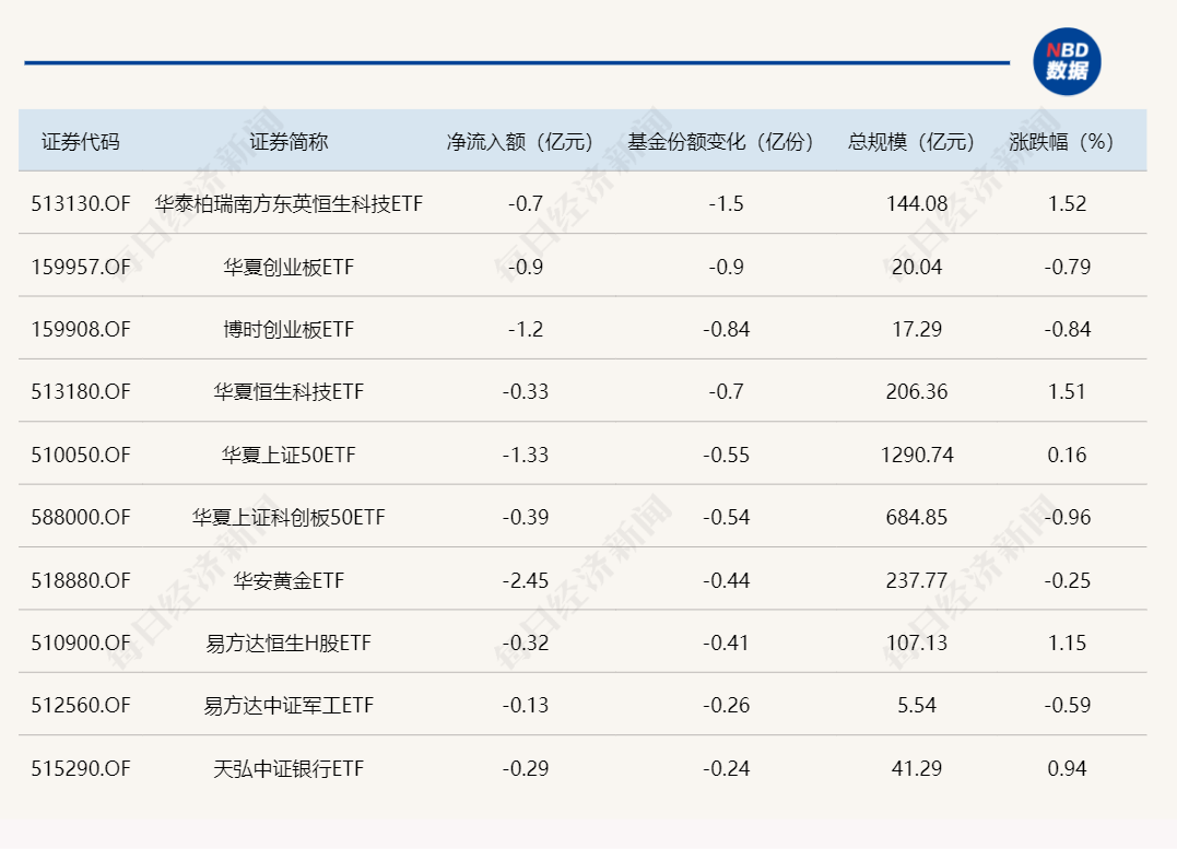 与此同时,华泰柏瑞南方东英恒生科技ETF的基金份额减少了1.5亿份,净流出额为0.7亿元;华夏创业板ETF的基金份额减少了0.9亿份,净流出额为0.9亿元;博时创业板ETF的基金份额减少了0.84亿份,净流出额为1.2亿元。