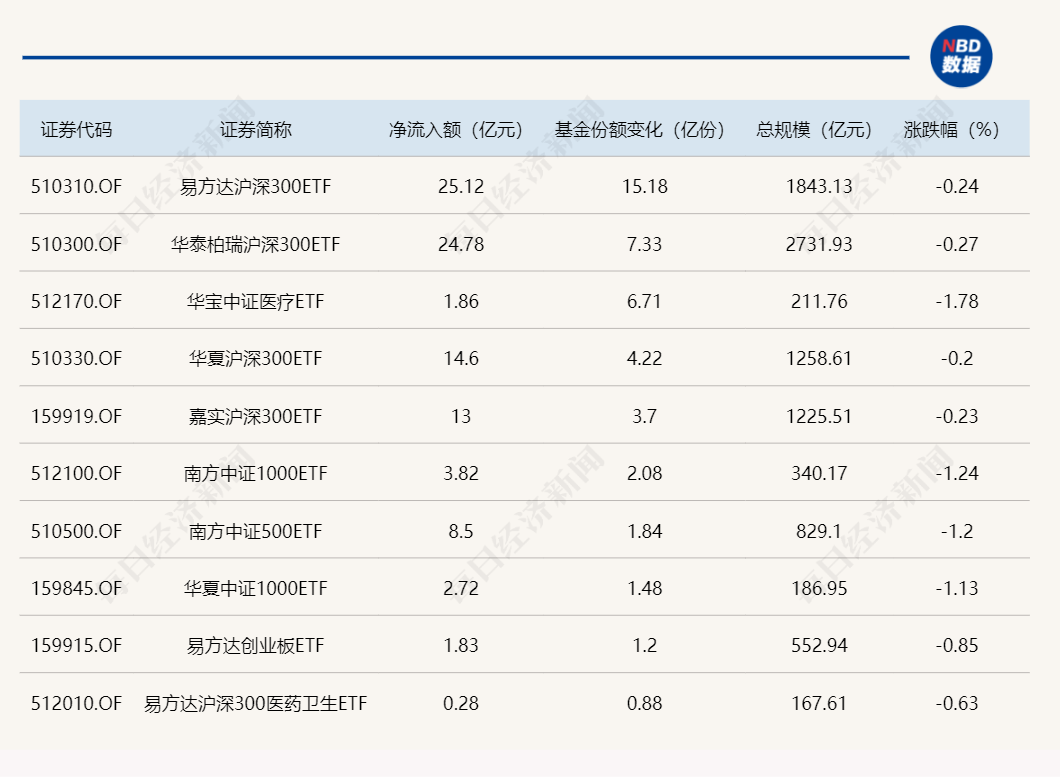 Wind数据显示,在8月22日的非货币ETF市场中,易方达沪深300ETF的基金份额增加了15.18亿份,净流入额为25.12亿元;华泰柏瑞沪深300ETF的基金份额增加了7.33亿份,净流入额为24.78亿元;华宝中证医疗ETF的基金份额增加了6.71亿份,净流入额为1.86亿元。