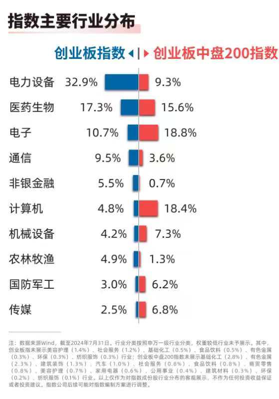 创业板投资工具也在不断丰富,指数体系持续完善。其中,创业板指由创业板中市值大、流动性好的100只股票组成,前三大权重行业分别为电力设备、医药生物、电子,合计占比超过60%;创业板中盘200指数由创业板中市值中等、流动性较好的200只股票组成,前三大权重行业为电子、计算机、医药生物,合计占比过半。
