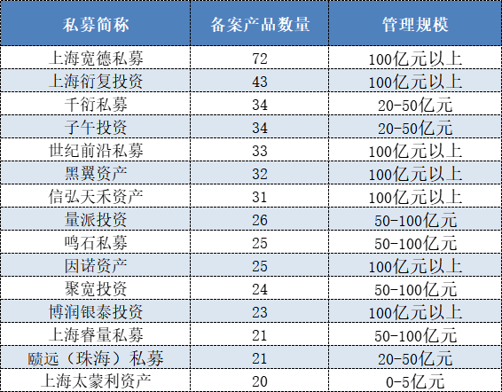 管理规模超百亿元的因诺(上海)资产、博润银泰投资,管理规模50-100亿元之间的量派投资、鸣石私募、聚宽投资、上海睿量私募以及管理规模20-50亿元的赜远(珠海)私募等,今年以来备案的产品数量也均超过了20只。
