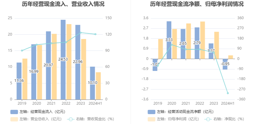 2024年上半年,公司营业收入现金比为120.58%,净现比为-304.55%。