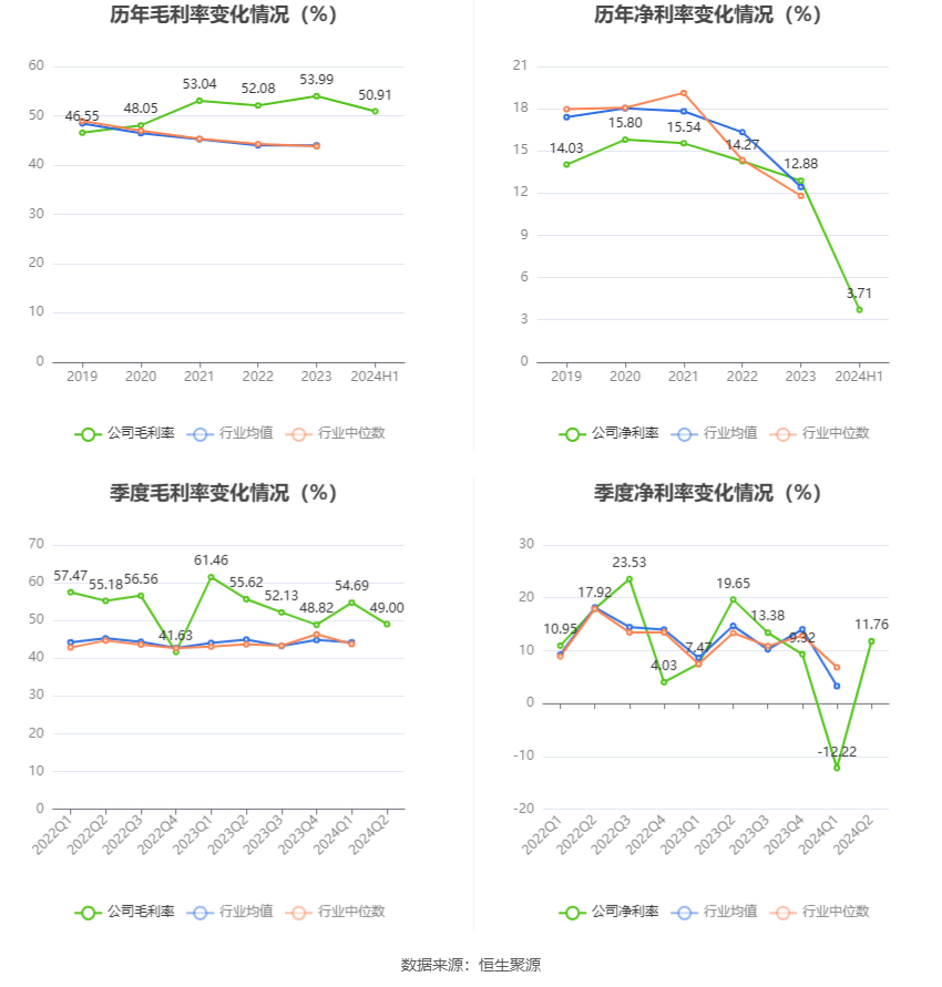 2024年上半年,公司毛利率为50.91%,同比下降7.07个百分点;净利率为3.71%,较上年同期下降11.01个百分点。从单季度指标来看,2024年第二季度公司毛利率为49.00%,同比下降6.62个百分点,环比下降5.69个百分点;净利率为11.76%,较上年同期下降7.89个百分点,较上一季度上升23.98个百分点。