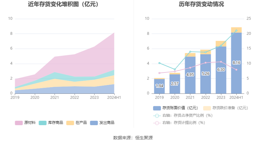 从存货变动来看,截至2024年上半年末,公司存货账面价值为8.16亿元,占净资产的21.09%,较上年末增加1.86亿元。其中,存货跌价准备为7066.32万元,计提比例为7.97%。