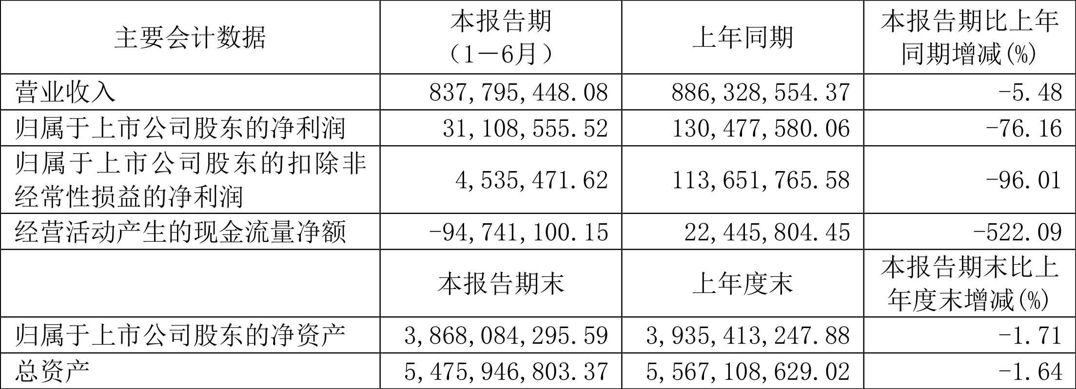 根据半年报,公司第二季度实现营业总收入5.57亿元,同比增长5.49%,环比增长97.94%;归母净利润6546.75万元,同比下降36.85%,环比增长290.54%;扣非净利润4331.97万元,同比下降51.62%,环比增长211.69%。
