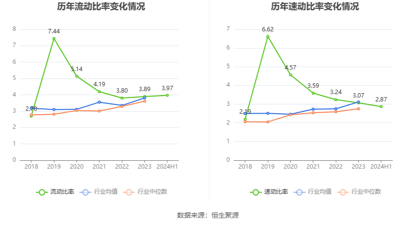 2024年上半年,公司流动比率为3.97,速动比率为2.87。