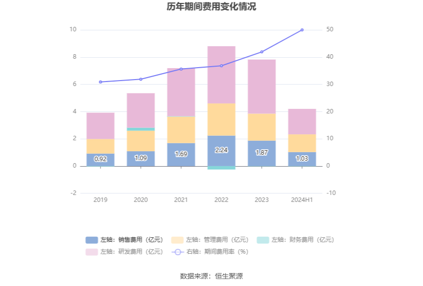 2024年上半年,公司期间费用为4.19亿元,较上年同期增加6197.30万元;期间费用率为49.97%,较上年同期上升9.73个百分点。其中,销售费用同比增长19.4%,管理费用同比增长35.43%,研发费用同比下降1.62%,财务费用由去年同期的-1597.68万元变为-177.29万元。