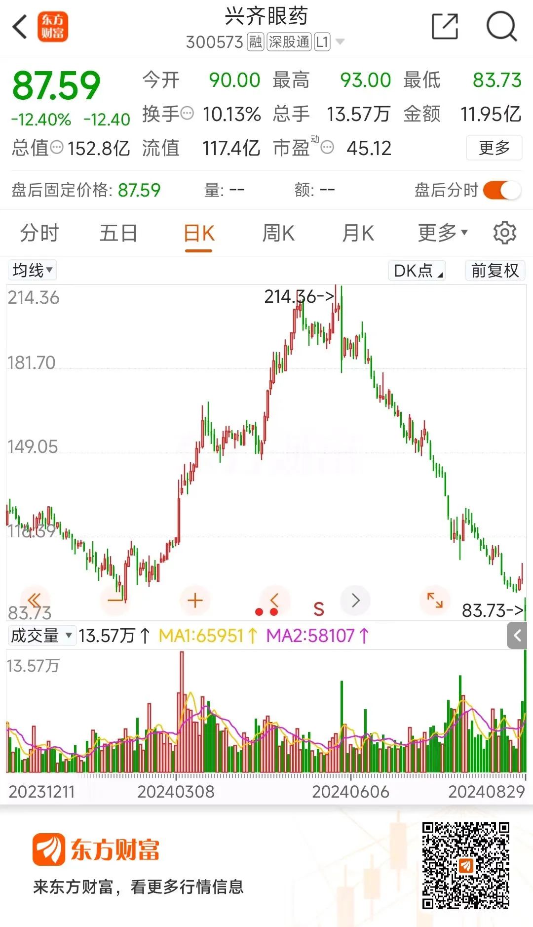 具体到个股,有“眼药水第一股”之称的兴齐眼药周四以9.99%大幅低开,盘中一度跌超16%,至收盘大跌12.4%,创2023年7月21日以来的逾一年最大单日跌幅。周四盘中,兴齐眼药最低触及83.73元,创下2023年8月29日以来的近一年新低。市值一天蒸发约22亿元,按其1.84万户股民计算,人均亏损约12万元。