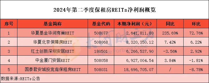具体来看,2024年第二季度,除国泰君安城投宽庭保租房REIT之外的4单保租房REITs合计实现净利润2415.57万元,同比增长11.31%,环比增长7.34%。其中,华夏基金华润有巢REIT同比增幅和环比增幅分别达到235.69%和72.76%:华夏北京保障房REIT同比增幅和环比增幅分别达到7.42%和6.22%。
