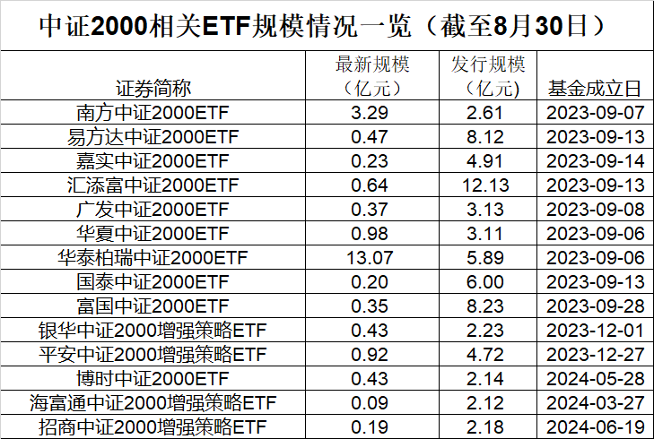 2023年8月25日,首批中证2000ETF获批,随后9只基金于9月份迅速发行并在当月成立。