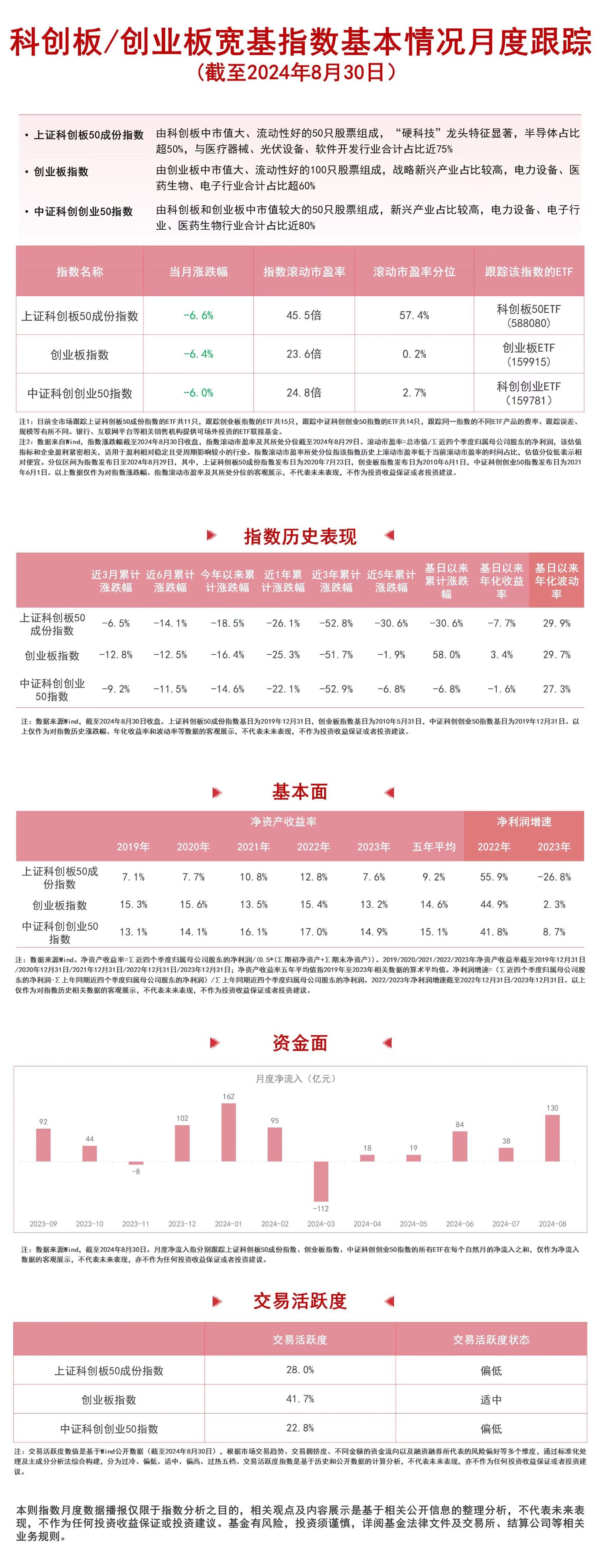 8月,中证科创创业50指数下跌6.0%,创业板指数下跌6.4%,上证科创板50成份指数下跌6.6%,资金连续五个月净流入跟踪以上指数的ETF产品。