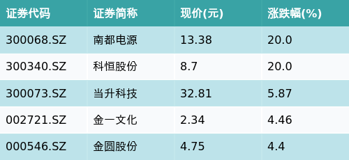 截至收盘,小金属概念主题涨跌幅最高的五只股票为:南都电源(300068.SZ)、科恒股份(300340.SZ)、当升科技(300073.SZ)、金一文化(002721.SZ)与金圆股份(000546.SZ)。详情见下表: