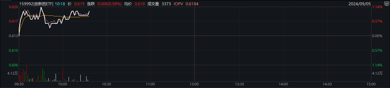 相关ETF方面,创新药ETF(159992)截至发稿涨0.98%,成交额超6000万元,换手率近1%。溢折率0.10%,盘中频现溢价交易。