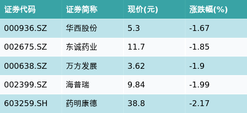 截至收盘,CRO/CMO主题涨跌幅最高的五只股票为:华西股份(000936.SZ)、东诚药业(002675.SZ)、万方发展(000638.SZ)、海普瑞(002399.SZ)与药明康德(603259.SH)。详情见下表:
