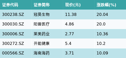 截至午间收盘,细胞免疫治疗主题涨跌幅最高的五只股票为:冠昊生物(300238.SZ)、阳普医疗(300030.SZ)、莱美药业(300006.SZ)、开能健康(300272.SZ)与海南海药(000566.SZ)。详情见下表: