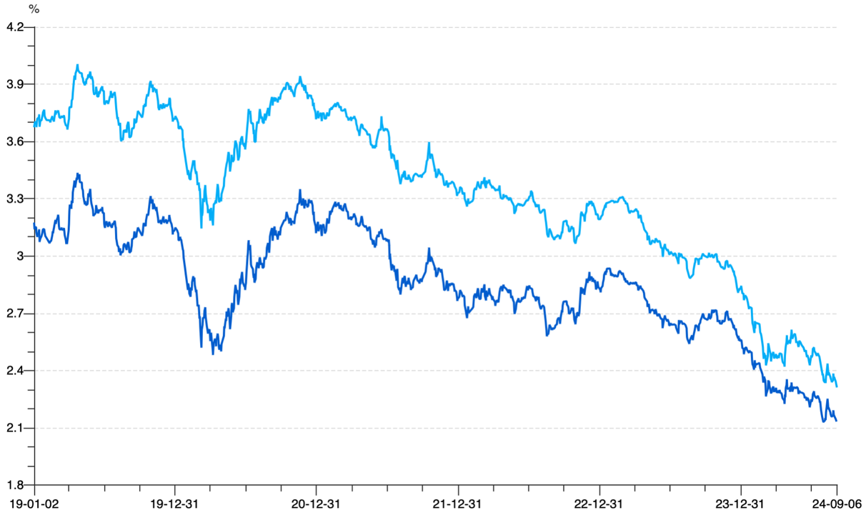 低利率环境下,保险投资收益承压。保险机构的资金投向以“固收+”策略为主,即以债券资产作为组合底仓,通过配置少量风险资产实现收益增厚,策略对于波动率和最大回撤等风险指标具有严格要求。近年来,受内外部不利因素影响,国内经济状况面临一定压力,这也导致了债券利率处于持续下行趋势。截至2024年9月6日,10年期和30年期国债到期收益率分别为2.14%和2.31%,处于自2019年以来的最低点。在不考虑资本利得的情况下,利率下行对于“固收+”组合的预期收益率产生了较大负面影响。