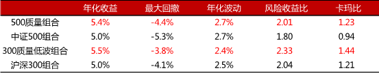 以质量指数作为风险资产进行配置,可以显著提升组合风险收益比。我们按照9:1的比例配置中债-总财富指数(CBA00301)和质量指数,构建“固收+”模拟组合并进行收益测算。自2014年以来,500质量组合年化收益5.4%,最大回撤-4.4%,风险收益比约为2,明显优于中证500组合;300质量低波组合在各项风险收益指标上同样占优。