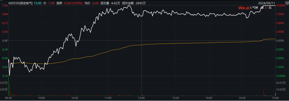 保变电气开盘后快速下探,一度触及跌停,随后又拉升走高,盘中触及涨停,上演“地天板”走势,尾盘再度封板。截至收盘,该股报7.04元,全日成交16.3亿元。