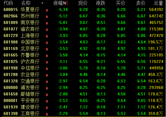 银行板块盘中大幅下挫,截至收盘,华夏银行、苏州银行、南京银行跌超5%,中国银行、农业银行跌逾3%,建设银行、工商银行跌逾2%。