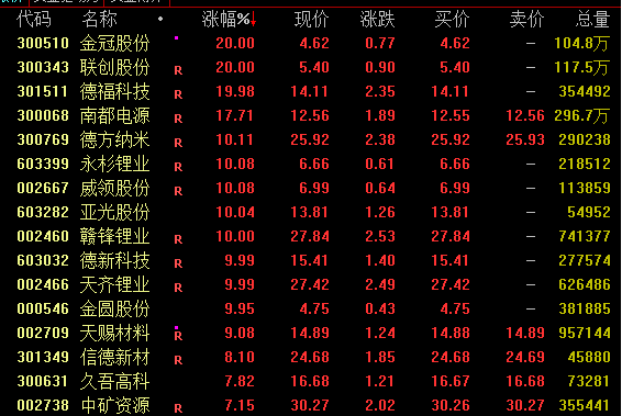 锂电池概念今日大幅拉升,截至收盘,金冠股份、联创股份、德福科技20%涨停,南都电源涨近18%,德方纳米涨逾10%,赣锋锂业、天齐锂业、金圆股份等均涨停。