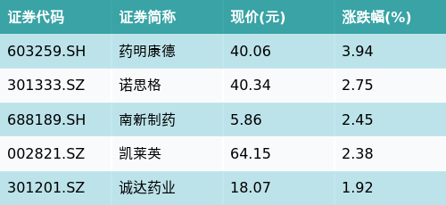 截至午间收盘,CRO/CMO主题涨跌幅最高的五只股票为:药明康德(603259.SH)、诺思格(301333.SZ)、南新制药(688189.SH)、凯莱英(002821.SZ)与诚达药业(301201.SZ)。详情见下表: