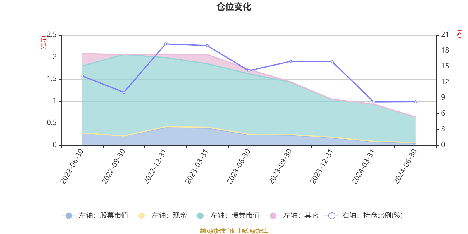 据定期报告数据统计,成立以来平均股票仓位为13.81%,同类平均为18.6%。2022年末基金达到19.31%的最高仓位,2024年一季度末最低,为8.24%。