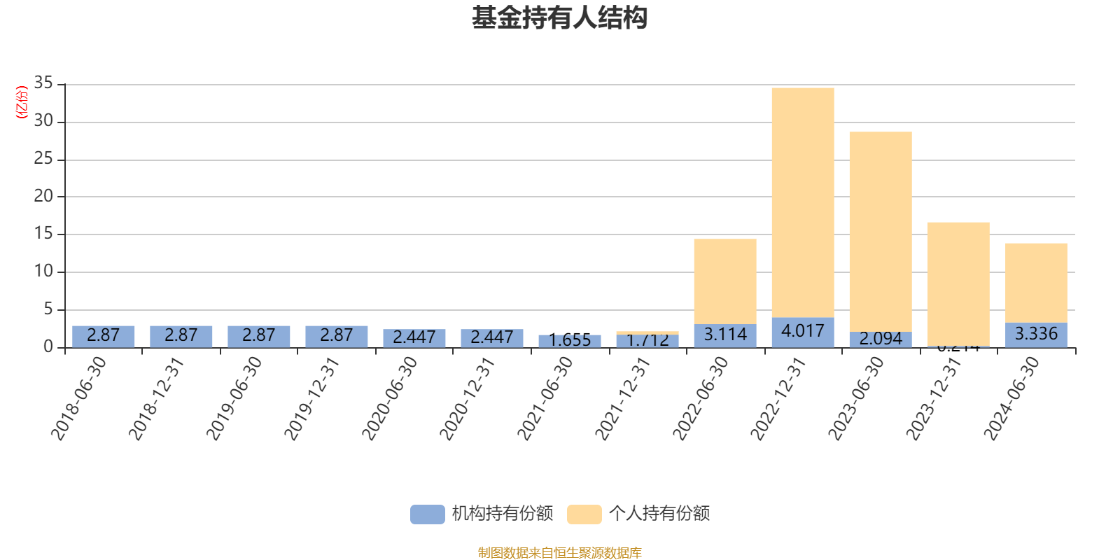截至2024年6月30日,基金持有人共计18.69万户,合计持有13.84亿份。其中管理人员工持有57.98万份,占比0.04%,机构持有份额占比24.11%,个人投资者占比75.89%。