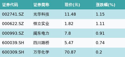 截至收盘,正极材料主题涨跌幅最高的五只股票为:光华科技(002741.SZ)、恒立实业(000622.SZ)、闽东电力(000993.SZ)、四川路桥(600039.SH)与万华化学(600309.SH)。详情见下表: