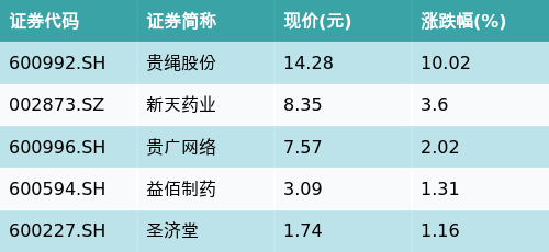 截至收盘,贵州主题涨跌幅最高的五只股票为:贵绳股份(600992.SH)、新天药业(002873.SZ)、贵广网络(600996.SH)、益佰制药(600594.SH)与圣济堂(600227.SH)。详情见下表: