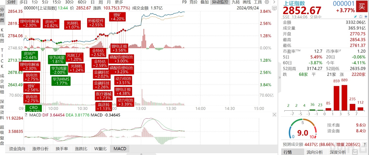 降准、降息以及结构性政策的推出,将为市场提供更为充足的流动性支持,有助于缓解资金压力,并稳定市场信心。消息发出后A股全面上涨,上证综指爆拉100点,涨幅超3.7%。