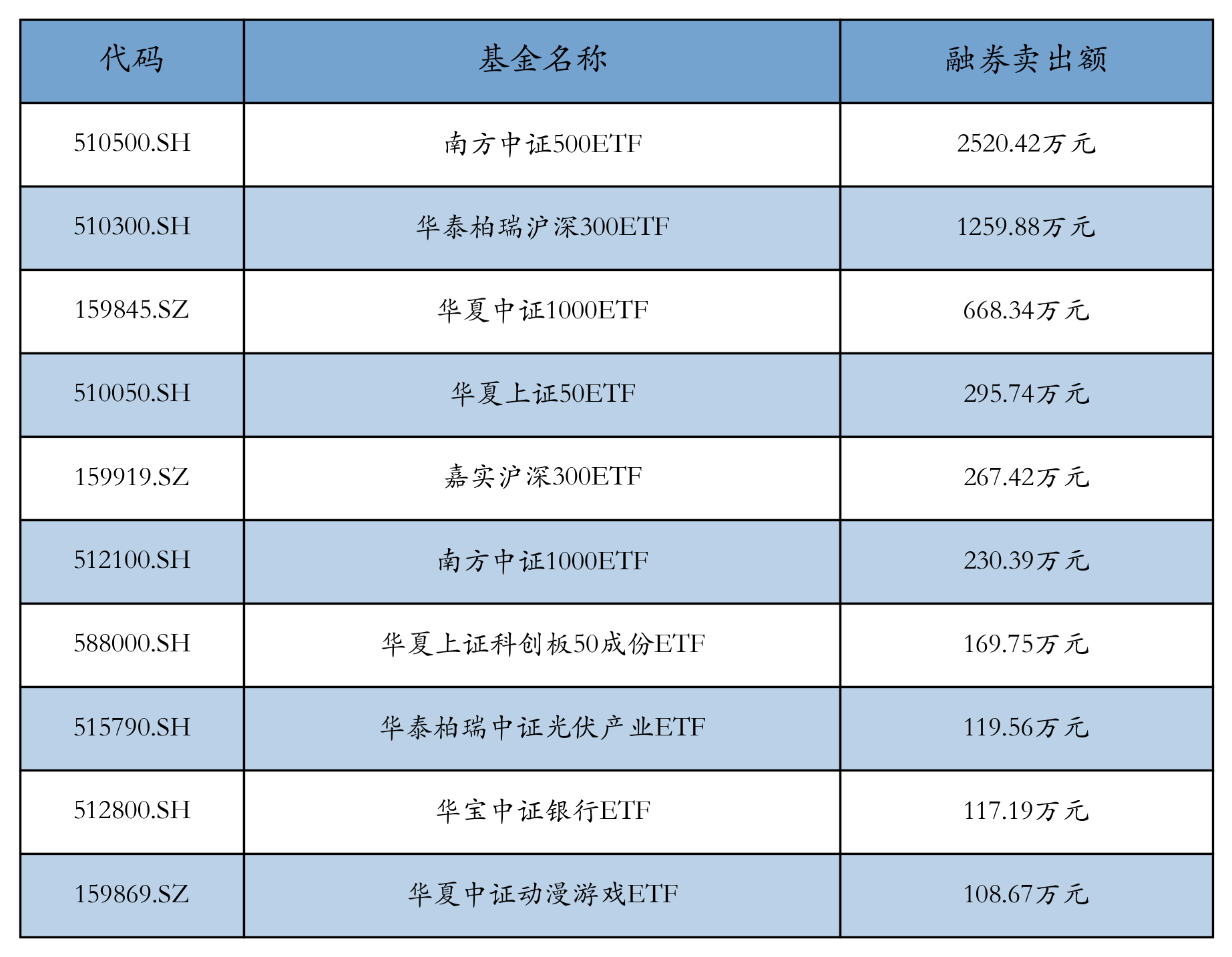 9月25日ETF融券卖出额前三位分别为:南方中证500ETF(2520.42万元)、华泰柏瑞沪深300ETF(1259.88万元)和华夏中证1000ETF(668.34万元),前10具体见下表: