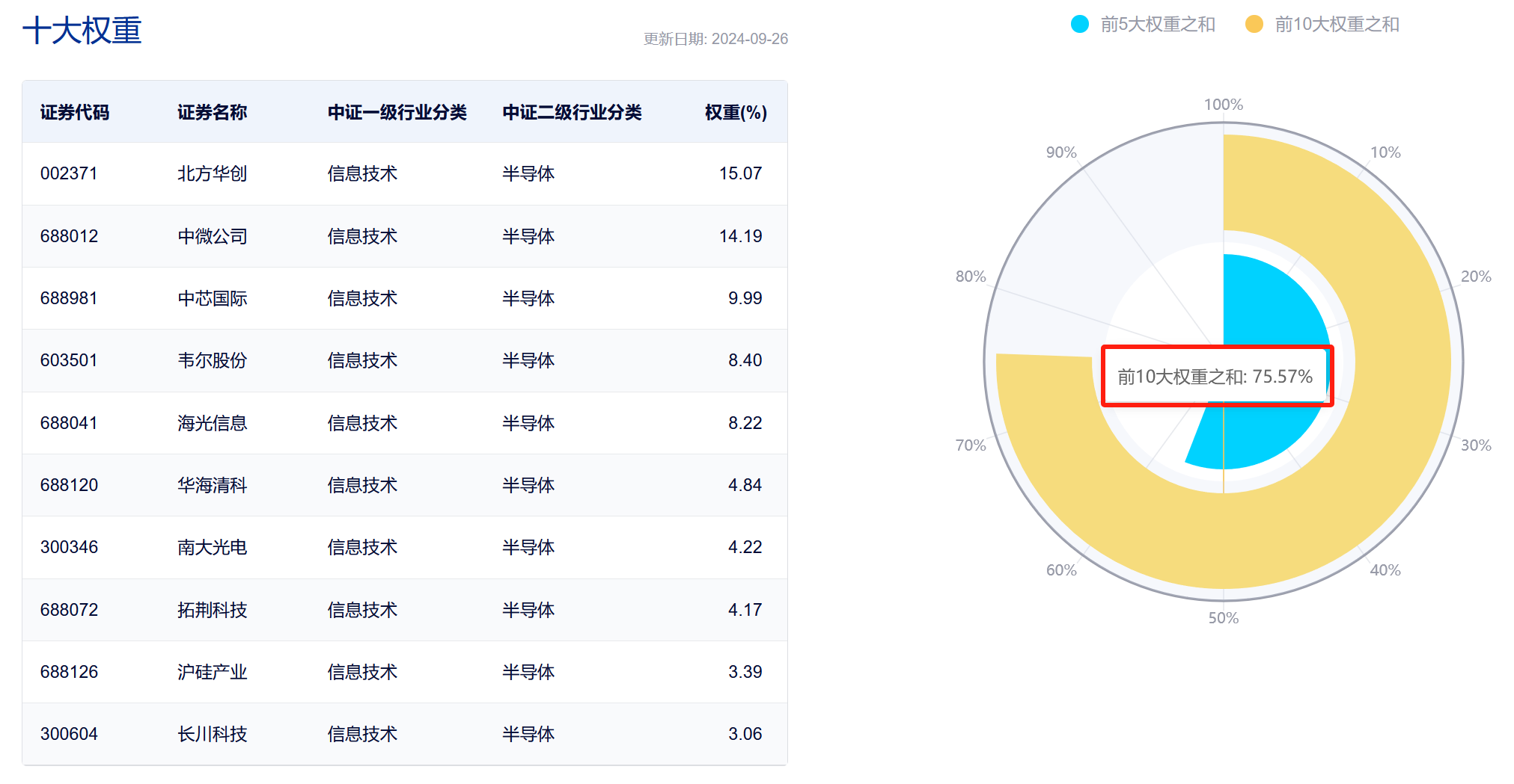 据了解,半导体设备ETF(561980)复制跟踪中证半导体产业指数(931865)走势,标的指数主要聚焦40只半导体设备、材料等上游产业链公司,前十大成份股覆盖北方华创、中微公司、中芯国际、韦尔股份、海光信息、华海清科、拓荆科技、南大光电、沪硅产业、长川科技等公司,合计占比约76%,指数集中度相对较高。