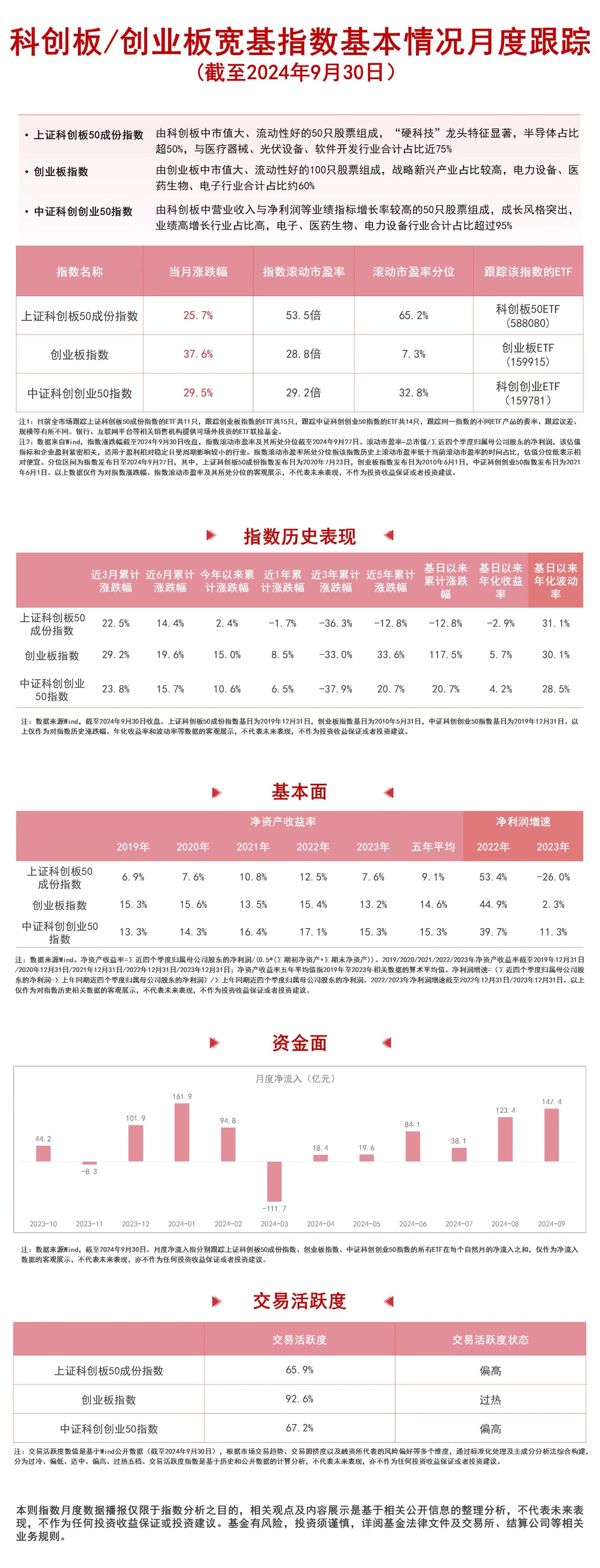 9月,创业板指数上涨37.6%,中证科创创业50指数上涨29.5%,上证科创板50成份指数上涨25.7%,资金连续六个月净流入跟踪以上指数的ETF产品。