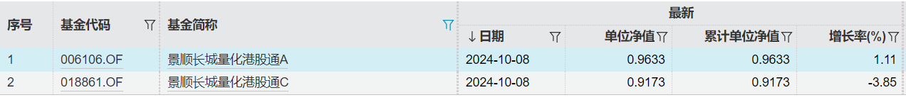 还有景顺长城量化港股通股票基金,A类份额的净值10月8日涨了1.11%,C类份额跌了3.85%。