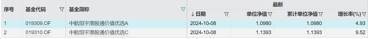还有中航恒宇港股通价值优选,A类份额的净值10月8日涨了4.93%,C类份额涨了9.52%。