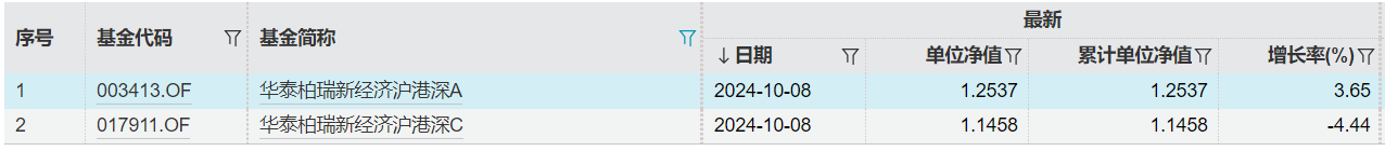 先来看华泰柏瑞新经济沪港深混合,A类份额的净值10月8日涨了3.65%,C类份额跌了4.44%。