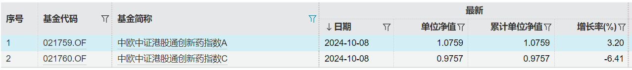 再比如中欧中证港股通创新药指数基金,A类份额的净值10月8日涨了3.2%,C类份额跌了6.41%。