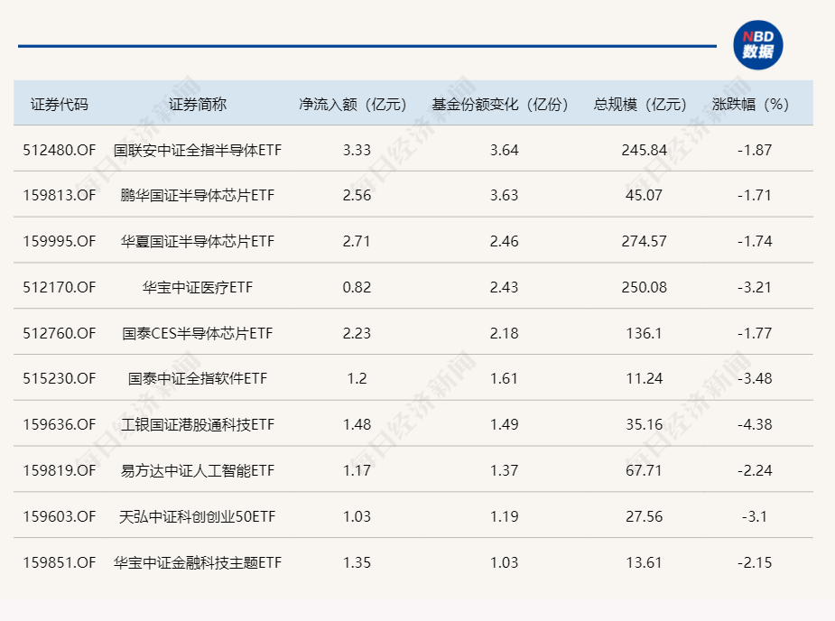 数据显示,在10月15日的非货币ETF市场中,国联安中证全指半导体ETF基金份额增加3.64亿份,净流入3.33亿元;鹏华国证半导体芯片ETF基金份额增加3.63亿份,净流入2.56亿元;华夏国证半导体芯片ETF基金份额增加2.46亿份,净流入2.71亿元。