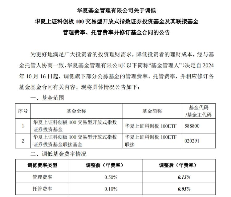 根据公告,华夏上证科创板 100ETF、华夏上证科创板 100ETF 联接、华夏中证科创创业 50ETF、华夏科创创业 50ETF 发起式联接原管理费率与托管费率分别为0.5%与0.1%,调整后的管理费率与托管费率分别为0.15%与0.05%。华夏基金表示此举是“为更好地满足广大投资者的投资理财需求,降低投资者的理财成本”。