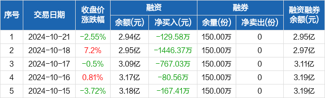 融资方面,当日融资买入5240.7万元,融资偿还5370.28万元,融资净偿还129.58万元,连续5日净偿还累计2590.96万元。融券方面,融券卖出0份,融券偿还0份,融券余量150万份,融券余额154.5万元。融资融券余额合计2.95亿元。