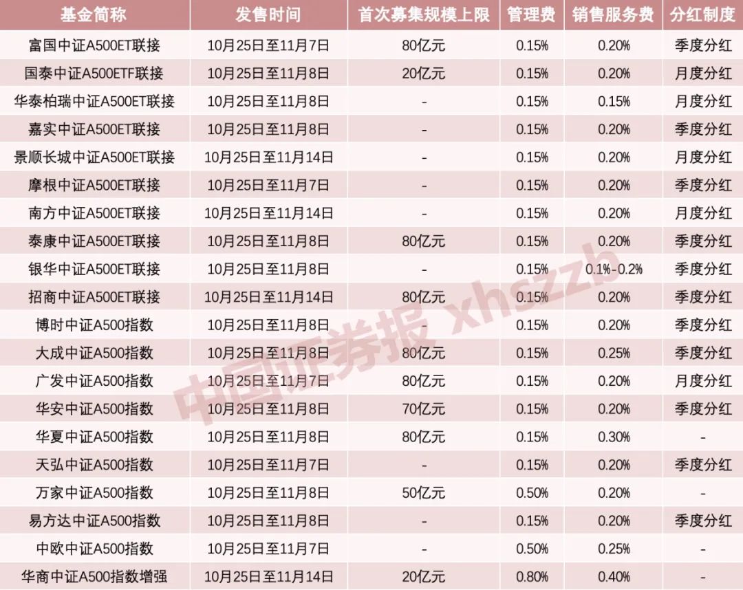 10月22日,10只中证A500ETF联接基金、9只中证A500指数基金、1只中证A500指数增强基金集体发布发售公告,宣布将于10月25日开售。