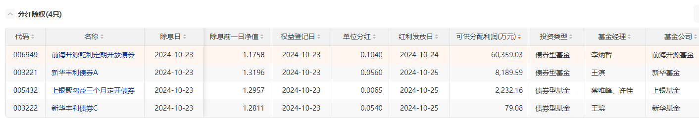 (原标题:23日共4只基金分红除权 累计可供分配利润7.09亿元)