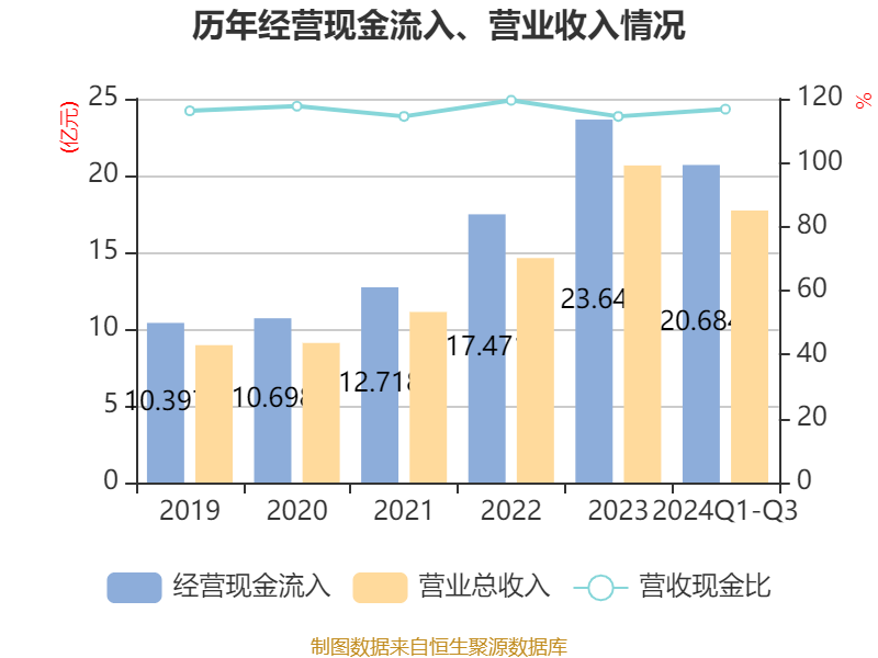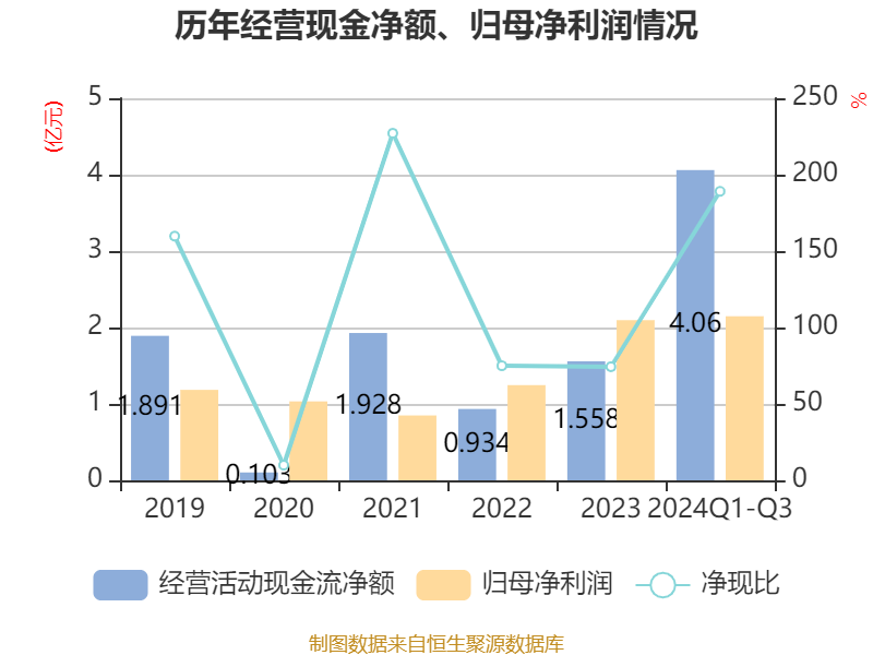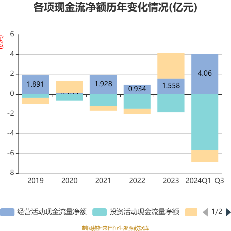 2024年前三季度,公司经营活动现金流净额为4.06亿元,同比增长107.26%;筹资活动现金流净额-1.2亿元,同比减少3.58亿元;投资活动现金流净额-5.64亿元,上年同期为-2.58亿元。