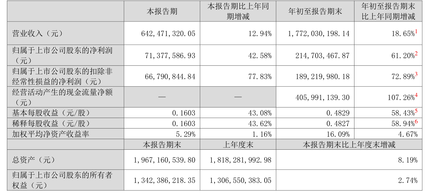 中证智能财讯劲仔食品(003000)10月24日披露2024年第三季度报告。前三季度公司实现营业收入17.72亿元,同比增长18.65%;归母净利润2.15亿元,同比增长61.20%;扣非净利润1.89亿元,同比增长72.89%;经营活动产生的现金流量净额为4.06亿元,同比增长107.26%;报告期内,劲仔食品基本每股收益为0.4829元,加权平均净资产收益率为16.09%。
