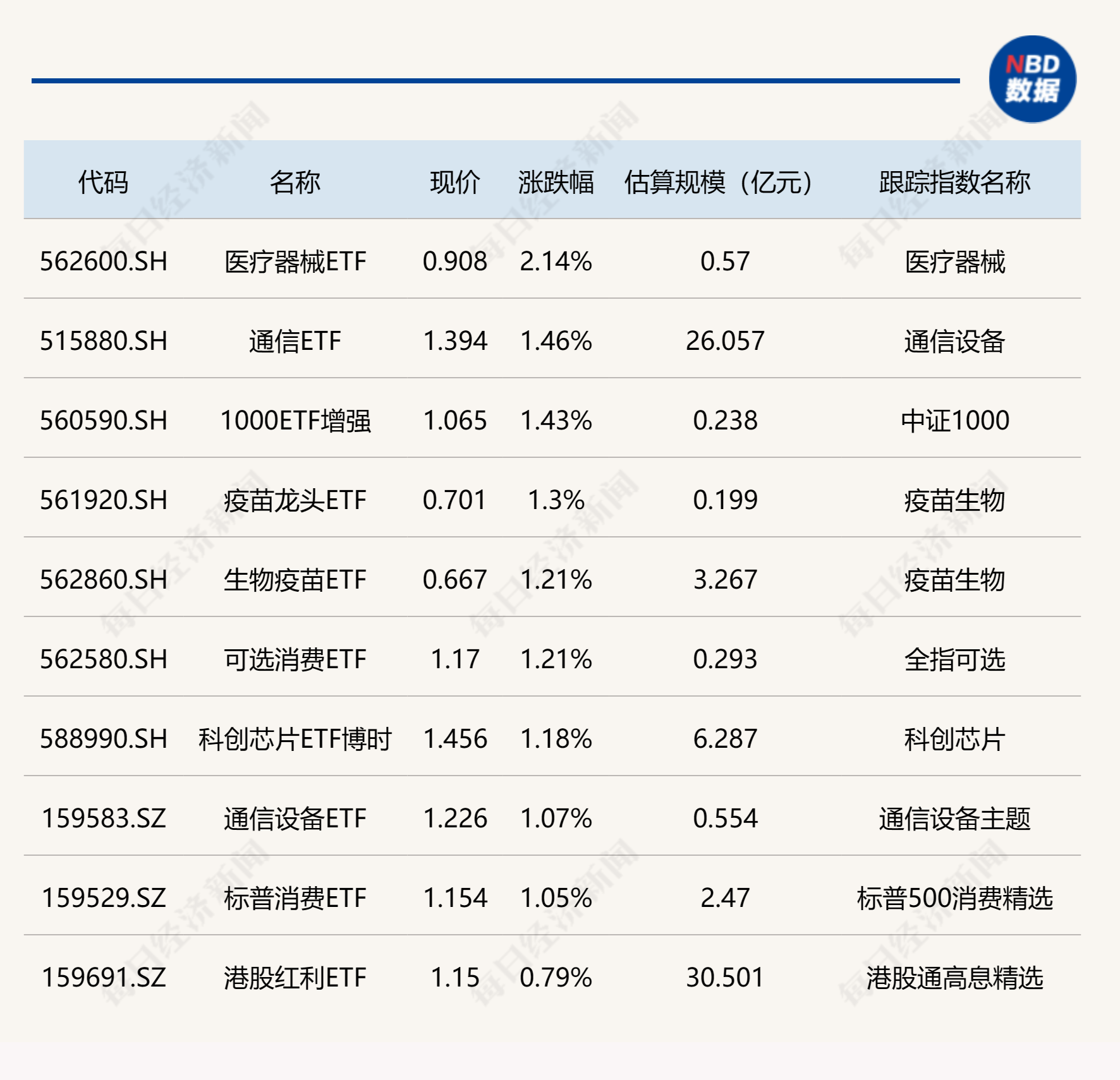 ETF涨跌幅方面,医疗器械ETF涨超2%,通信、生物疫苗等ETF涨超1%。