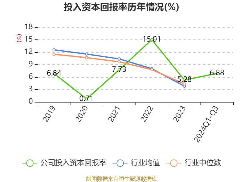 盈利能力方面, 2024年前三季度公司加权平均净资产收益率为7.57%,同比上升2.76个百分点。公司2024年前三季度投入资本回报率为6.88%,较上年同期上升2.58个百分点。