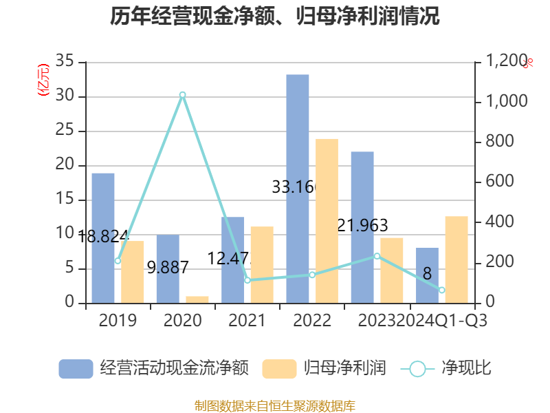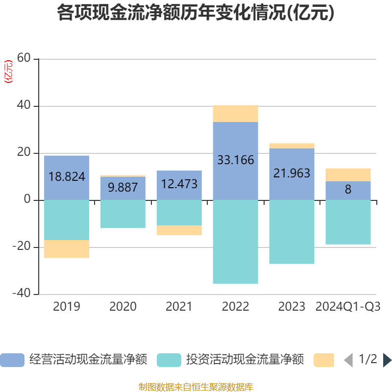 2024年前三季度,公司经营活动现金流净额为8亿元,同比增长13.79%;筹资活动现金流净额5.38亿元,同比增加9.31亿元;投资活动现金流净额-18.92亿元,上年同期为-8.45亿元。