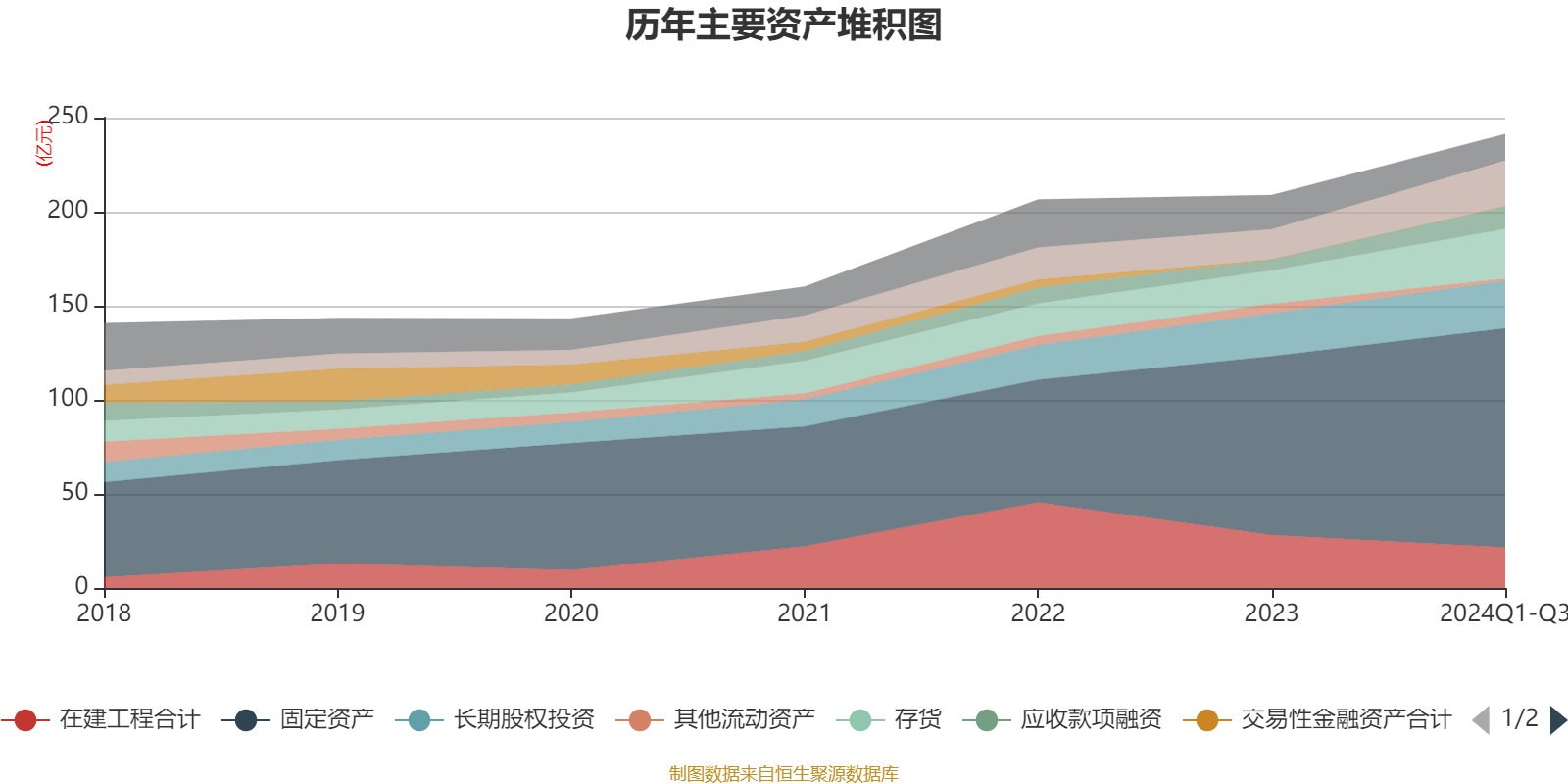 资产重大变化方面,截至2024年三季度末,公司在建工程合计较上年末减少23.28%,占公司总资产比重下降4.26个百分点;货币资金较上年末减少22.8%,占公司总资产比重下降2.72个百分点;存货较上年末增加49.62%,占公司总资产比重上升1.96个百分点;应收票据及应收账款较上年末增加51.43%,占公司总资产比重上升1.9个百分点。