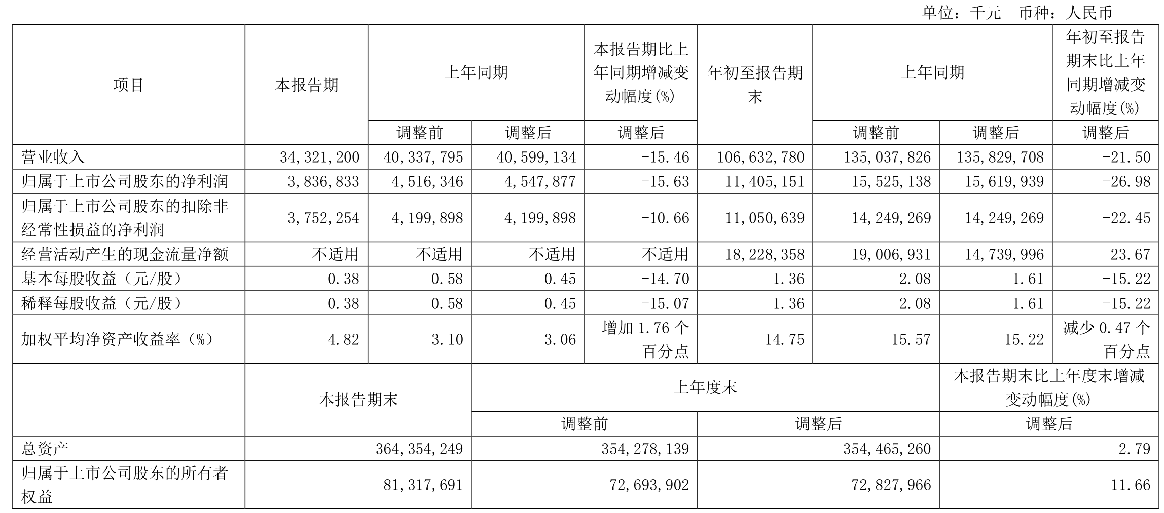 根据三季报,公司第三季度实现营业收入343.21亿元,同比下降15.46%,环比增长5.03%;归母净利润35.16亿元,同比下降19.0%,环比下降11.45%;扣非净利润37.52亿元,同比下降10.66%,环比增长3.33% 。