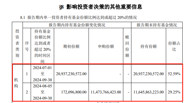 三季报显示,第二位机构投资者期初持有5.96亿份,三季度大举增持386.37亿份,按照区间成交均价测算,增持金额约为635亿元。中间份额合并后,期末持有196.08亿份,总市值达到788.1亿元。